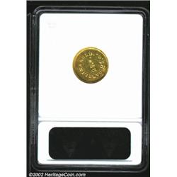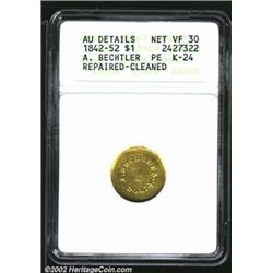 Pioneer gold coinage is uniquely American. The phenomenon of a circulating private gold coinage that resulted from the Southern Appalachia and Western gold rushes is unparalleled. Although other gold-producing nations have created emergency coinage in small quantity, only the expanding U.S. and its determined pioneers found an answer to the pressing currency problems of the frontier in private coinage of gold. In all some $50 million worth of these special coins were issued between 1830 and 1861. The first private gold coiner was Templeton Reid in Georgia in 1830. All of his issues are extremely rare today. A year later in the North Carolina gold district of Rutherfordton, Christopher Bechtler along with his son Augustus and nephew Chris Jr. struck more than 30 different varieties of gold coins to provide a critical need for a medium of exchange. They became by far the most prolific and longest active private coiners, striking coins for more than 20 years. Twenty years after the first gold rush, California exploded with greatest outpouring of gold in history. Again, private companies answered the need for an adequate medium of exchange. Eventually, the government established the United States Assay Office, a provisional mint, employing Augustus Humbert as assayer, until a U.S. Branch Mint could finally be authorized. The tremendous proliferation of private gold coins in a period of only seven years (1848-1855) spread throughout the area until some thirty different companies in California as well as Utah and Oregon, were involved in issuing private gold coins, patterns, and ingots. The third gold rush and resulting rash of private gold coins came five years after the last private gold coin was struck in California. A new gold-mining bonanza appeared in Colorado and by the time its impact began to subside, at least three firms there, as well as the Mormons in Utah, had used the newly mined Colorado gold to issue private gold coins. In each of these gold rushes, private coins were accepted in circulation. They filled the void left by an insufficient supply of Federal coinage. At least $50 million worth were struck, of which 97-98% were melted. There is no doubt that these pioneer gold coins helped bring our nation out of its underdeveloped status and into a strong sound economy. PIONEER GOLD & PATTERNS FROM THE JACK KLAUSEN COLLECTION For more than three decades, Jack Klausen was considered the foremost dealer in Pioneer/Territorial Gold coins. Besides assorted rarities he could always be counted on to have a half dozen or so $50 octagonal and round slugs. When researching for what was to become my doctoral dissertation and later my book on this field, Jack was not only generous with his time and information but essential. While he sold much of his inventory over the last few years, it is with great pleasure and pride that I have been asked to catalog the following items from Jack's collection. THE BECHTLERS The first gold rush in this nation began in 1828 in Georgia and North Carolina; the new influx of gold dust necessitated a better economic system than the barter and subsistence farming in use. A short-lived coining operation run by Georgia jeweler and cotton gin manufacturer, Templeton Reid, only lasted a few months in 1830. Christopher Bechtler, Sr., together with his son, Augustus, and his nephew, Christopher Jr., began their coinage production in North Carolina a year after the first private gold coiner, Templeton Reid (1831). Beside being the first large-scale gold coiners prior to the establishment of the Charlotte Mint (1838), the Bechtlers have the added distinction of being the first to strike gold dollars--eighteen years prior to the United Sates' Mint. So well accepted were their coins, that thirty years later monetary obligations of the Confederacy were specified as payable in "Bechtler gold" rather than Union coins, Confederate, or state currency. When efforts to obtain a branch mint failed, several merchants requested the Bechtlers to assay their gold dust and convert it into coin. Bechtler made his own coining machinery, with the coins being stamped with the weight of the piece, its fineness in carats, and its dollar value. More than 30 different varieties in $1, $2 1/2, and $5 pieces were produced until the operation was closed in 1852.(1842-52) G$1 A.Bechtler Dollar, 27G. 21C.--Repaired, Cleaned--ANACS. AU Details, Net VF30. The peripheries are intermittently tooled and hairlined, with the centers have the myriad pinpricks associated with jewelry use. Territorial Gold coins are always popular regardless of condition. The dies are rotated approximately 270 degrees clockwise from coin turn. Important notice: We expect to be auctioning lots at the rate of 200-250 per hour. Sometimes eBay Premier live bid software cannot keep up with that pace, so we strongly recommend that you place a realistic proxy bid now as insurance to avoid disappointment. Also please note that all Heritage/CAA lots purchased through eBay Premier carry a 20% Buyer's Premium. Please make sure you read the Terms and Conditions.