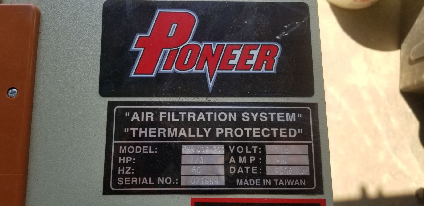 pioneer model pnr c-12-250 AIR FILTRATION SYSTEM 110V 140 CFM