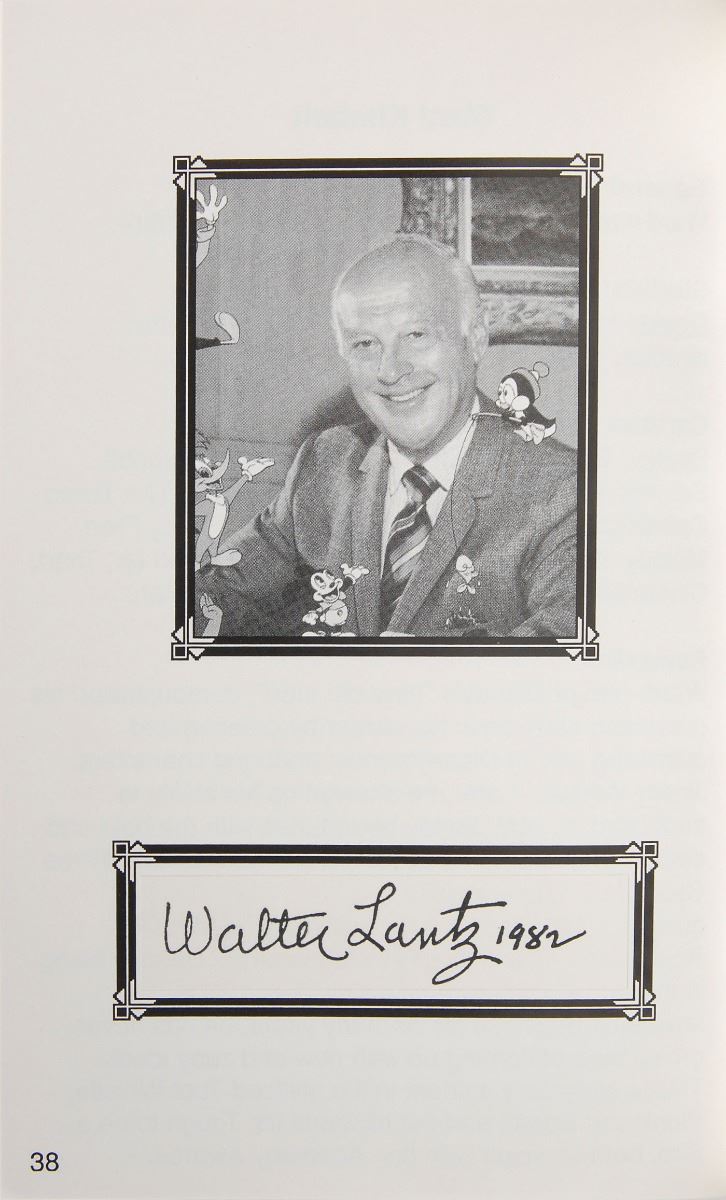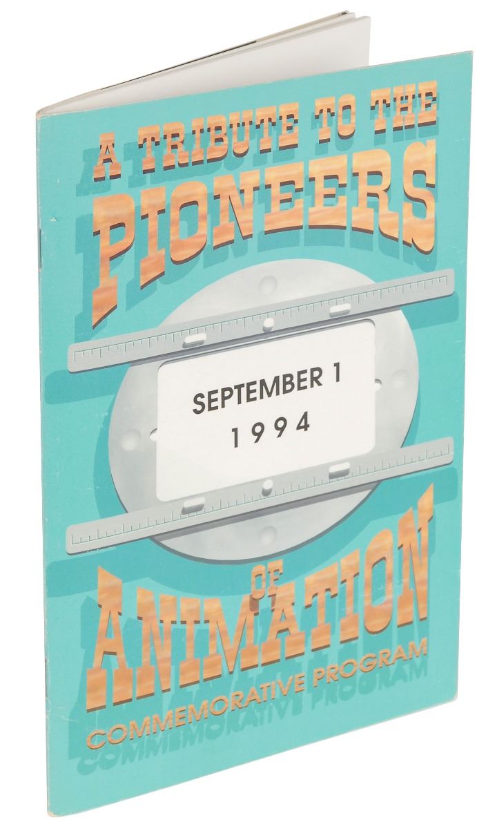 Commemorative program for A Tribute to the Pioneers of Animation, September 1, 1994, 5.5 x 8.5, 64 pages, signed in felt tip and ballpoint on slips affixed throughout by 26 animators, including: Bob Allen, Ed Benedict, Dick Bickenbach, Preston Blair, Shamus Culhane, Marc Davis, Ron Dias, Eyvind Earle, Bob Givens, Bill Hurtz, Ollie Johnston, Paul Julian, Ward Kimball, Walter Lantz, Bill Melendez, Maurice Noble, Ken O’Connor, Bill Peet, Virgil Ross, Irv Spence, Frank Thomas, Richard Thomas, Myron Waldman, Clair Weeks, Lou Zukor, and Morey Zukor. In fine condition.