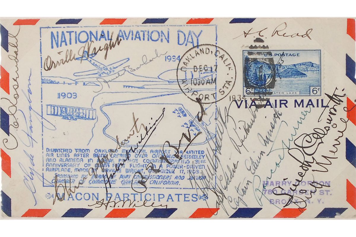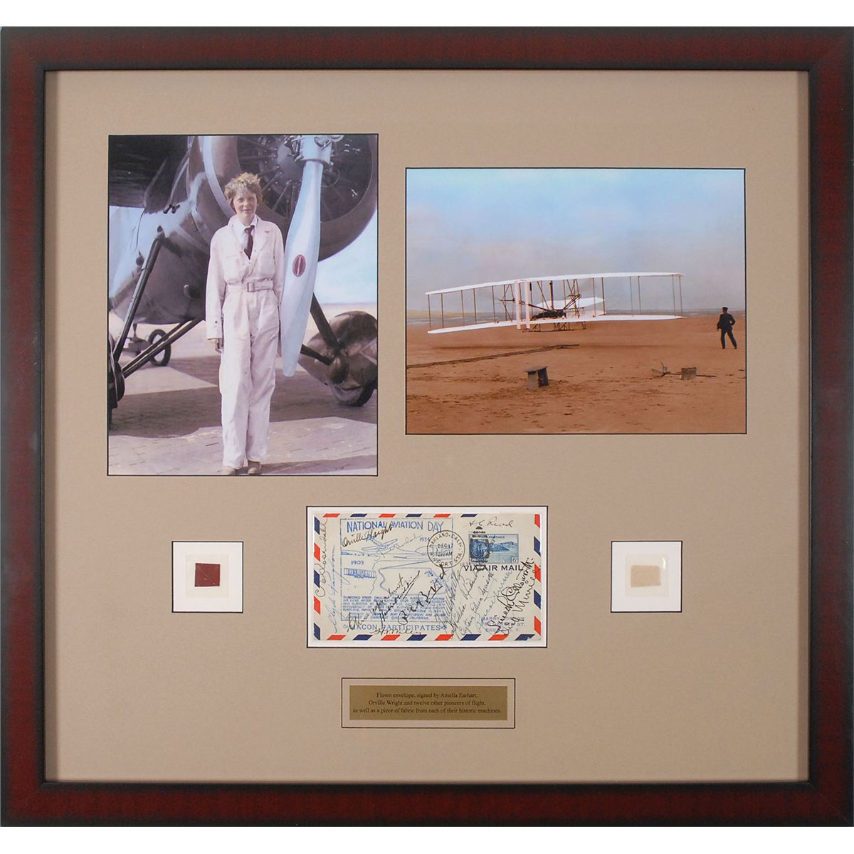 Exceptional commemorative cover with a stamped cachet honoring National Aviation Day in 1934, signed in ink by 15 pioneers of flight: “Orville Wright,” “Amelia Earhart,” “C. E. Rosendahl,” “Clyde Pangborn,” “A. C. Read,” “C. Kingsford-Smith,” “Hubert Wilkins,” “R. E. Byrd,” “Frank Hawks,” “Capt. Eddie Rickenbacker,” “Captain Edwin Musick,” “Roscoe Turner,” “Lincoln Ellsworth,” “Dick Merrill,” and “H. V. Wiley.” The cover was flown in an aerial parade on December 17, 1934, commemorating the 31st anniversary of Orville Wright’s first flight in a power-driven airplane, as described on the cachet. Nicely double-matted and framed with images of Wright and Earhart to an overall size of 24.5 x 23, also presenting two small swatches of original fabric from their planes: Earhart’s Lockheed Vega 5B and the original Wright Flyer. In fine condition. A most impressive display of aviation history, featuring three items of the utmost desirability. Oversized.