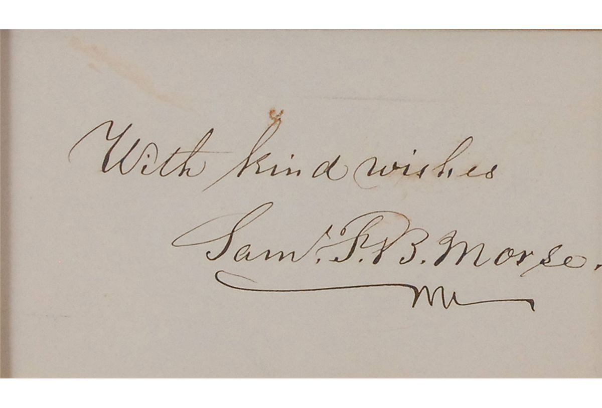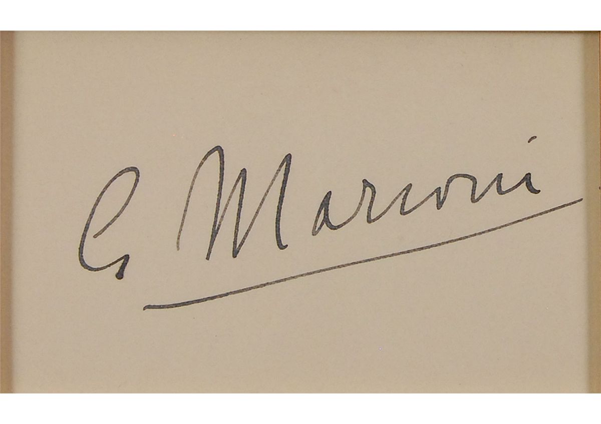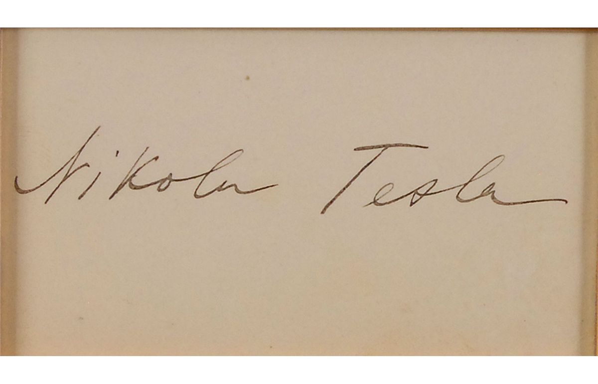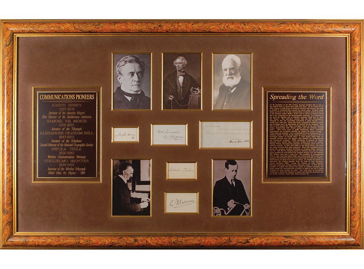 Exceptional collection of five bold ink signatures of communication pioneers Nikola Tesla, Alexander Graham Bell, Samuel F. B. Morse, Guglielmo Marconi, and Joseph Henry, all on individual cards except for Bell, which is a brief TLS. Beautifully suede-matted and framed together with images of each innovator and descriptive plaques to an overall size of 27.5 x 44.5. In overall fine condition. A highly desirable assemblage of scarce signatures from these scientists and inventors that revolutionized communication in the modern world. Oversized.