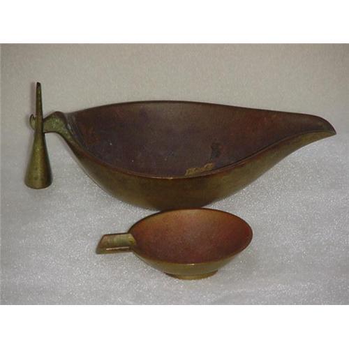 A heavy weight brass pipe ashtray with a pipe cleaner and taper, 6 1/2" long, 4" wide. The small ashtray is also brass, 3" long, 2 1/2" wide. Condition of both is good the patina on both is marred by use and they could be polished or just left alone, they are handsome either way. (3)