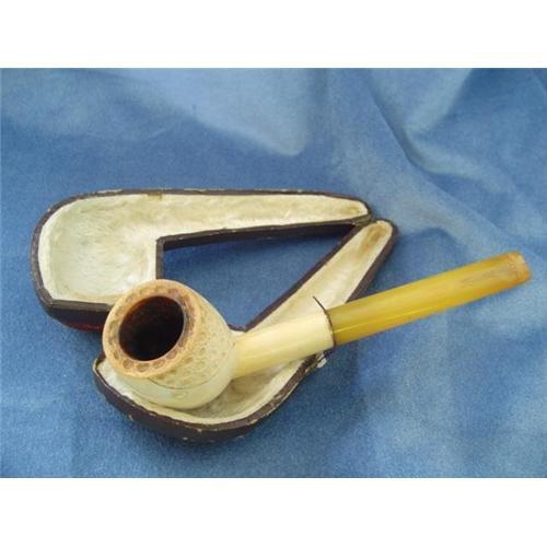 NOTE! This pipe was purchased from the estate of Cato Adams in 1986. He was a Black gentleman, featured in Our World magazine in the 1950s. Mr. Adams had an extensive collection of pipes from around the world. Each one had been smoked at least one. This attractive 2" tall bowl - MEERSCHAUM pipe has a light amber stem and the case is inscribed BLOCK-MEERSCHAUM. There are teeth marks on the stem. (2.7 oz)
