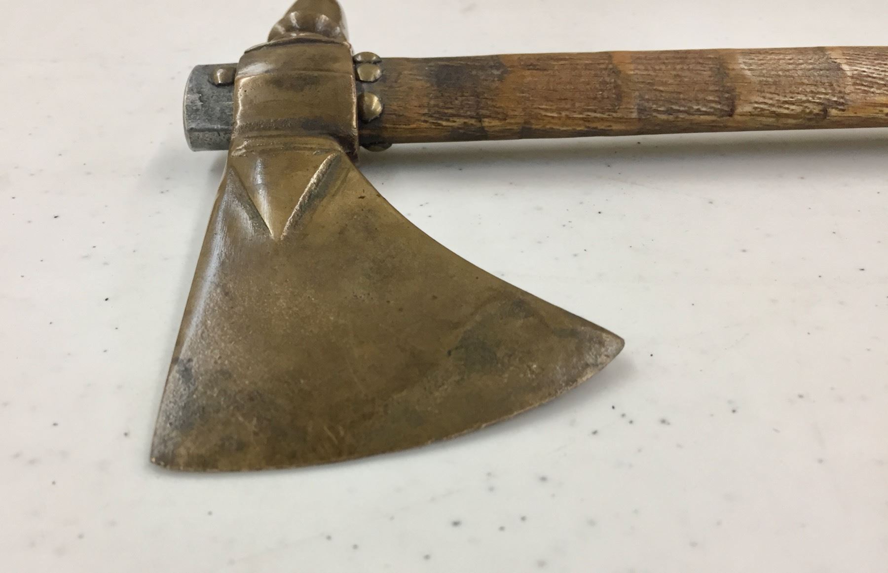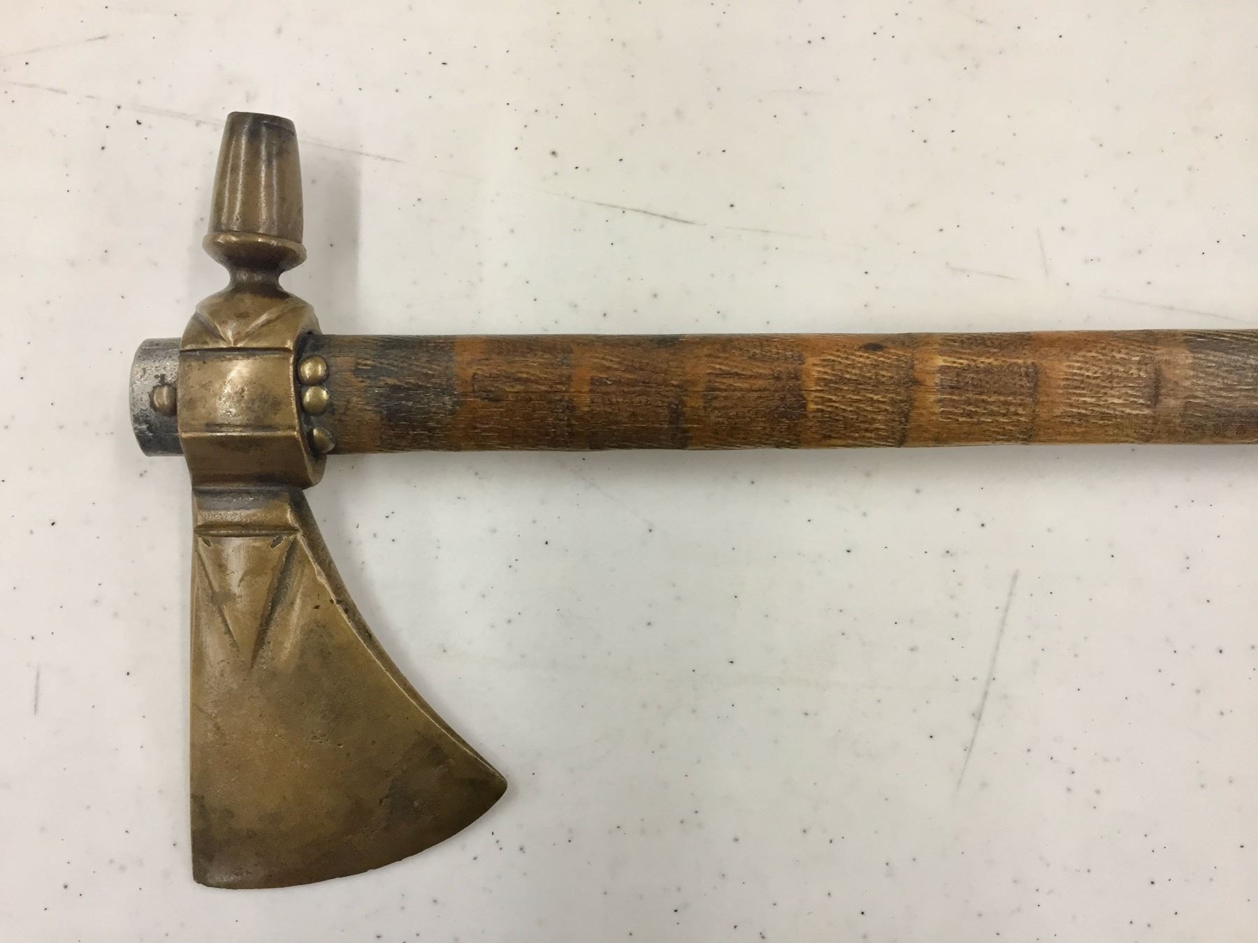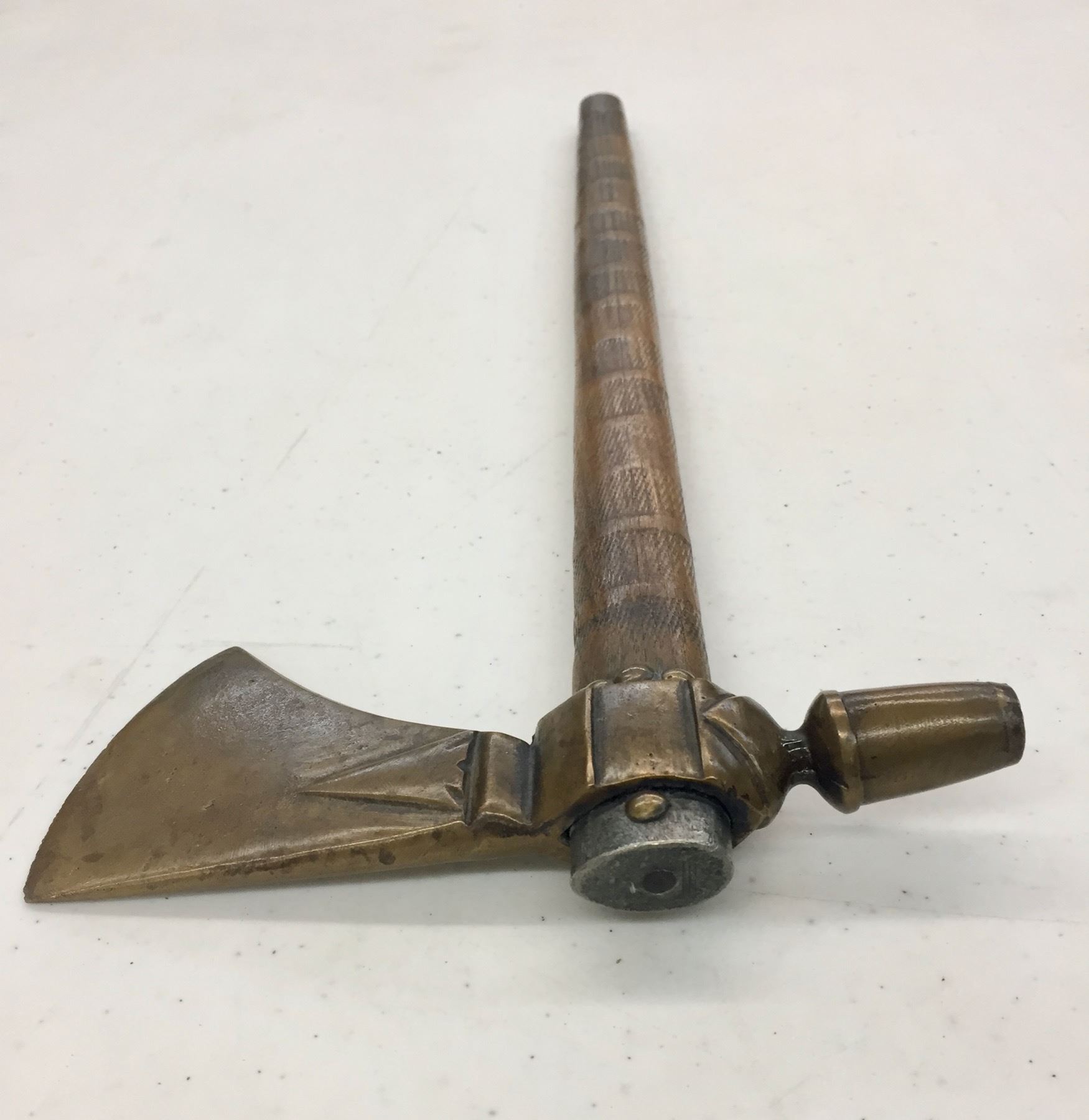 Description: Offered for sale in this lot is a an old pipe tomahawk from the late 19th Century. The head is brass and there are decorative brass tacks on the handmade wood stem. It has been smoked quite a bit. Maker: Unknown. Approx. Age: Late 19th Century. Size: 7-1/4”w x 19” long. Condition: Good for its age, some wear expected. Please look closely at the pictures - they are an important part of our description. Shipping: There will be a $10 handling / packaging fee for shipping this lot. The actual cost of postage will be added on top of that.