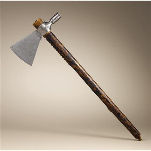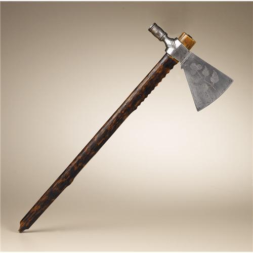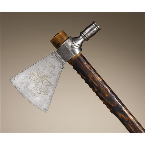 <B>Pipe Tomahawk by J. Wilson</B></I><BR>Circa 1850<BR>Length 23 in. overall; Length 8 1/2 in. the blade<BR><BR>The hand forged iron blade is decorated on one side with a brass inlaid foliate motif and cold stamped five point stars at the corners. The opposing side is rocker engraved with a similar foliate design and the same cold stamped stars. The blade is fitted to an ash wood handle with a carved scallop pattern near the top, hot file branding overall, and a deep brown patina.<BR>The majority of pipe tomahawks were made by frontier blacksmiths who labored in obscurity. By and large, little is known about them and their craft. Wilson embellished the classic features of the Plains tomahawk with stamping, engraving, and inlay. His tomahawk blades are quite distinctive and readily identifiable. Examples are present in a number of important collections. Harold Peterson illustrates two Wilson tomahawks in his classic study (See: Peterson, Harold, <I>American Indian Tomahawks,</B></I> Museum of the American Indian, Heye Foundation, 1971, item 188, p. 118 and item 198, p. 120). Both tomahawks are in the collections of the National Museum of the American Indian. Another example is rocker engraved with the words "Made by J. Wilson" along the edge of the blade. This tomahawk was collected from an Omaha Indian around 1860. (See: Baldwin, John, <I>Tomahawks and Pipe Axes of the American Frontier,</B></I> Early American Artistry Trading Company, West Olive, Michigan, 1995, p. 103.)<BR><BR>Provenance<BR>Chandler-Pohrt Collection, catalogue number 618.<BR><BR> <BR><BR><B>Important notic