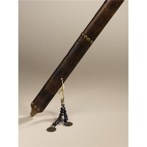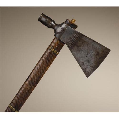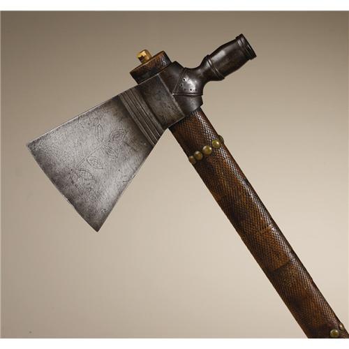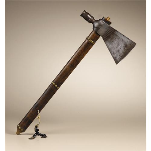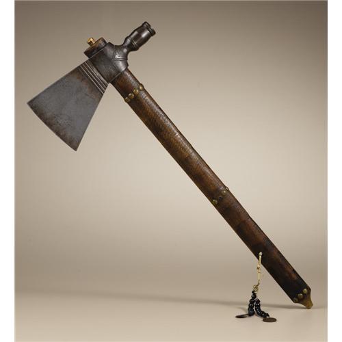 <B>Pipe Tomahawk by J. Wilson with Bead and Coin Pendant</B></I><BR>Circa 1850<BR>Length 19 1/2 in. overall; Length 8 in. the blade<BR><BR>This hand forged iron pipe tomahawk is decorated on the blade and eye with rocker engraving in a variety of floral and foliate motifs. The blade is fitted to an ash wood handle that is decorated with brass tacks and hot file branding. The handle exhibits a deep brown patina. There are two short strands of faceted cobalt blue beads, each ending with an Indian head cent, tied to the handle.<BR><BR>Provenance<BR>Chandler-Pohrt Collection, catalogue number 905.<BR><BR>
