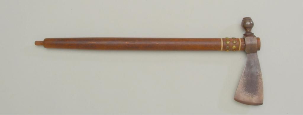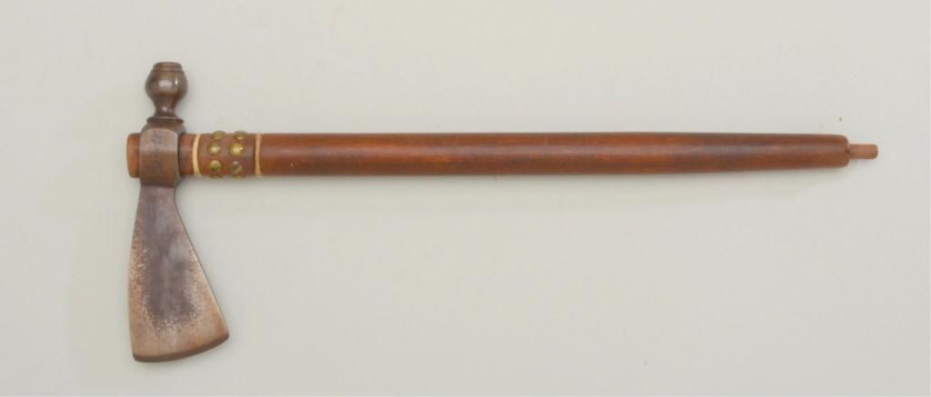 Pipe tomahawk of unknown age with dark patina on iron head, plain wood shaft with brass tack decoration at the top of the shaft and simple smoking stem; in overall good condition. Est.: $150-$300.