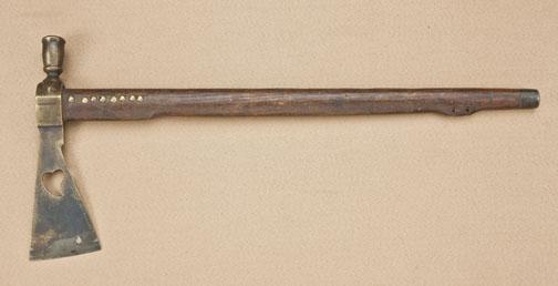 Pipe tomahawk with cast brass and steel inlaid edge to blade on original pewter mounted and brass tacked shaft showing pierced heart decoration. Circa early 19th century. The head measures approx. 9-3/4” from tip of blade to end of bowl. Blade shows 3-1/8” across the edge and shows a well inlaid steel insert. The head shows some punch-dot decoration and a good dark patina. The shaft marries the head well and appears to have been with it its entire life and shows a pewter mouth piece, correct drilled holes for dangles, which are irregular. The shaft is hand-carved from hardwood and shows 8 tacks on each side. The shaft shows good patina and both the head and shaft are genuine to the 18th century. Est: $3,000 -6000