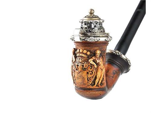 Carved meerschaum, silver lid decorated with putti heads. On the pipe-bowl there is a coat of arms with savages dressed in animal skins. Adler Fülöp and Son, Budapest. Late 19th century. Size: 66 cm