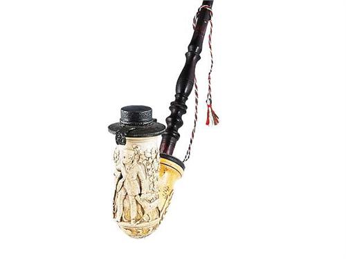 Carved meerschaum, silver lid. Rococo motifs, hunter leaning on his riffle with his dog in front of a vine arbour. The turned stem is later replacement. Vienna, 1840, Heinrich Müller. Size: 72 cm
