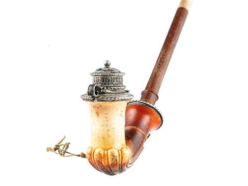 Carved meerschaum, silver lid. On the pipe-bowl there is a stylised decoration. Original case. Marked: Adler Fülöp and Son, Budapest, late 19th century. Size: 76 cm