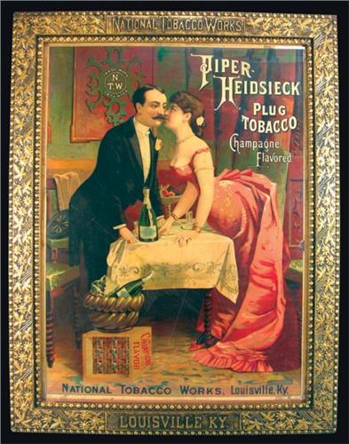 Piper Heidsick Paper Cigar Sign, National Tobacco Works Louisville, KY 1886. Very rare in original frame. Tear from 9:00 to 5:00 and at 3:00 and some restoration otherwise fair condition. Overall 25 X 33 inches.