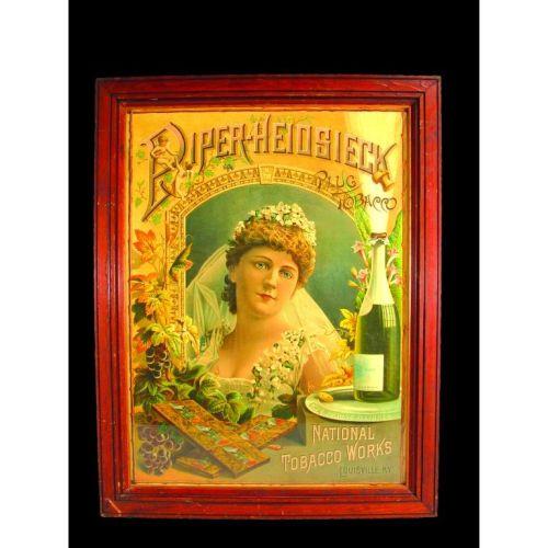 Piper Heidsieck Plug Tobacco Paper Sign, small scratch on her forehead otherwise excellent condition, Framed Under Glass, image only 20 x 27 inches.