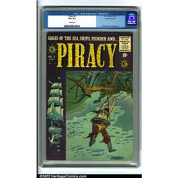 Piracy #5 Gaines File pedigree 12/12 (EC, 1955). Bernard Krigstein's dynamic cover for this issue illustrates his uncanny ability to create movement and drama with a minimum of brushstrokes. Sparse and clean, Krigstein was one of the true artists to graduate from the EC stable, and his talent is well-represented here. This copy shows some signs of wrinkling in the upper left front corner and a very slight blunting of the corners, but is overall very attractive and desirable, with outstanding page quality. Top-notch work by Reed Crandall, George Evans, and Graham Ingels round out this superb issue. CGC VF+ 8.5 White pages. Overstreet 2001 FN 6.0 value = $34; NM 9.4 value = $125. Important notice: We expect to be auctioning lots at the rate of 200-250 per hour. Sometimes eBay Premier live bid software cannot keep up with that pace, so we strongly recommend that you place a realistic proxy bid now as insurance to avoid disappointment. Also please note that all Heritage/CAA lots purchased through eBay Premier carry a 20% Buyer's Premium.