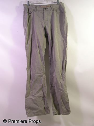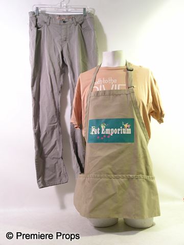 Jake Forester (Steven R. McQueen) screen worn, hero, slightly dirty, dark tan with 'Pet Emporium' logo on the front, adjustable straps, pockets in the front apron with tie around the waist, faded orange short sleeve, crew neck with 'death to the Pixies' in white on the front, 'Cinder Block' t-shirt, (size M) and grey with dark grey pinstripes 'John Varvatos' pants. (size 32)