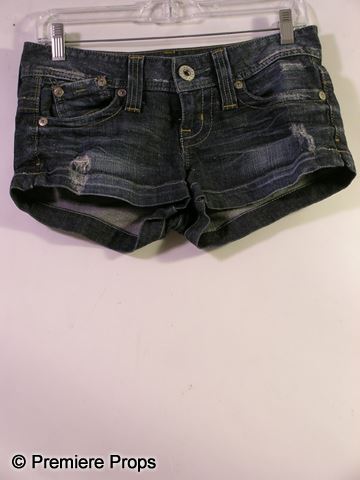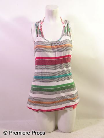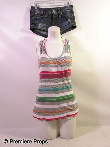 Kelly Driscoll (Jessica Szohr) screen worn, white with pink, yellow, and brown stripes, spaghetti straps, 'ella moss' racerback tank top, (size S) white with pink, orange, and brown abstract lines 'Rip Curl' spaghetti strap, reversible bikini top, (no tags) white with orange circular print, elastic waist with drawstring 'Rip Curl' swim shorts, (size XS) and dark blue denim wash with holes 'Guess' short jean shorts. (size 26)