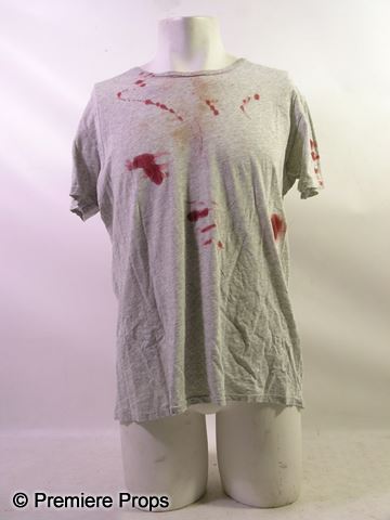 Jake Forester (Steven R. McQueen) screen worn, hero, bloody, brown, blue, and cream plaid, short sleeve button front, collar, left breast pocket, 'Organic' shirt, (size S) very bloody heathered grey, short sleeve crew neck 'Gap' t-shirt, (size M) and shiny olive green polyester, elastic waist 'Faded Glory' shorts. (size M 32/34)