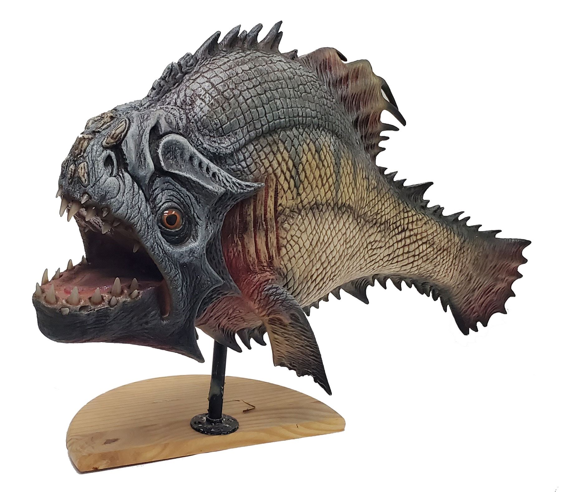 Large silicone piranha used in the production of the horror comedy film Piranha 3DD. There were different sized Piranha used in the film, this is the largest version which is made of silicone and features a very realistic paint scheme. This piece features glass eyes and dense, urethane rubber teeth. This item is attached to a metal rob and wooden base and will require special shipping due to its size and weight. This piece remains in excellent, production used condition.