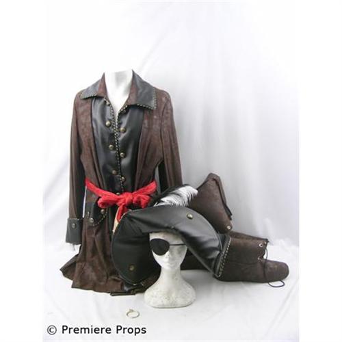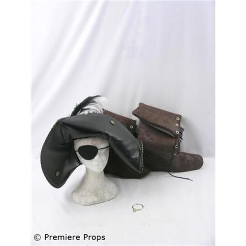 From David E. Kelley Productions - Men's Pirate Costume w/ brown/black w/ gold fake buttons / second lace up layer l/s jacket, black pirate boots w/ brown boot covers, black w/ black/white braided trim / black/white feathers pirate hat, black eyepatch, gold plastic earring (Fits All Sizes)(DEK1040)