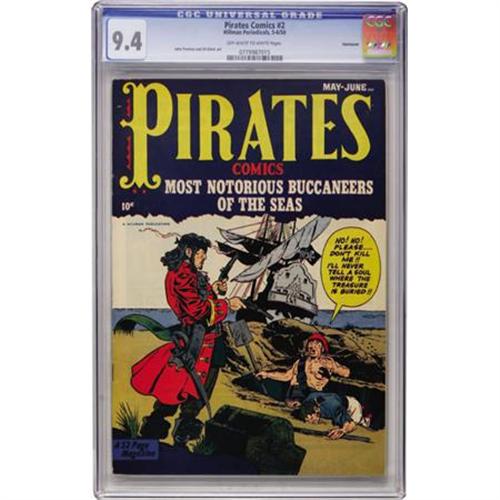 <B>Pirates Comics #2 Vancouver pedigree (Hillman Publications, 1950) CGC NM 9.4 Off-white to white pages.</B></I> Neat cover art makes this one well worth a look... as does the outstanding condition! Overstreet 2007 NM- 9.2 value = $210. CGC census 6/07: 1 in 9.4, none higher.<BR><BR><b>Shipping:</b> Comics - Slabbed (certified) (<a target="_blank" href="http://www.heritageauctions.com/common/shipping.php">view shipping information</a>)