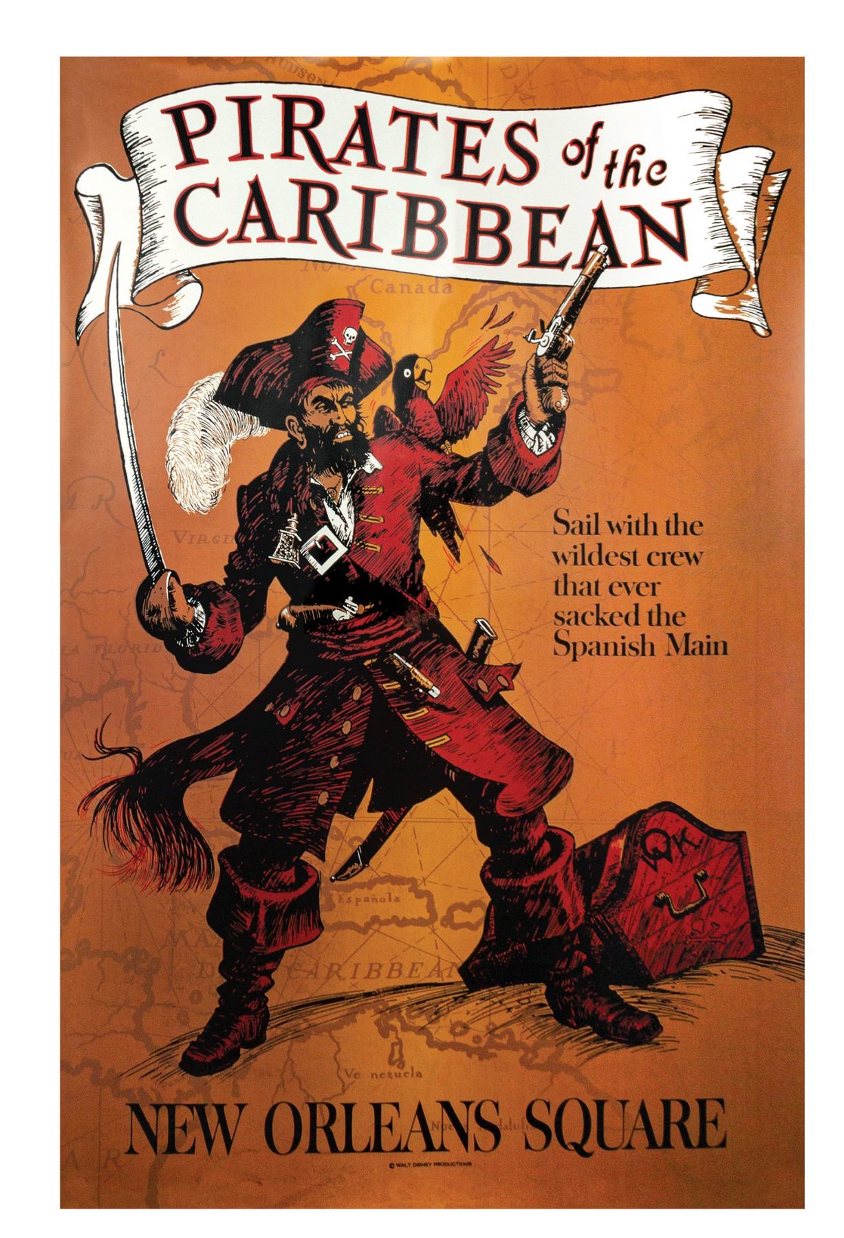 (Disneyland, 1990s) A full-size attraction poster reproduction from the Disney Gallery for the Pirates of the Caribbean. For a very short time, the Disney Gallery offered a limited amount of full-size reproduction attraction posters for many of the well-known Disneyland attractions. This faithful replica measures 54"x36" and is in very good condition.