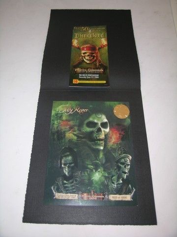 This is a Pirates of the Caribbean, limited edition animation art piece. The artwork is numbered 8020/10000 and was released on March 18, 2007 to commemorate the Pirates of the Caribbean online game. Also included is an unused Disneyland Pirates of the Caribbean 50th Anniversary Program from June 24, 2006.