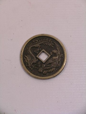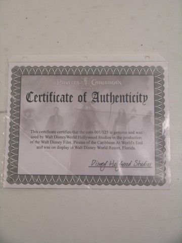 From the third installment in the mega-blockbuster Pirates series, 'Pirates of the Caribbean: At World's End' (2007), this is prop Asian 'treasure coin.' The coin was used by Walt Disney World Hollywood Studios in the 'At World's End' production and was also on display at Walt Disney World Resort, Florida. The coin is made from a brass looking material, with Asian writing characters on one side and a dragon image on the reverse and has a square 'hole' cut into the center. It comes with a COA that is numbered 001/125. (coin measures approx. 1 3/4" diameter)