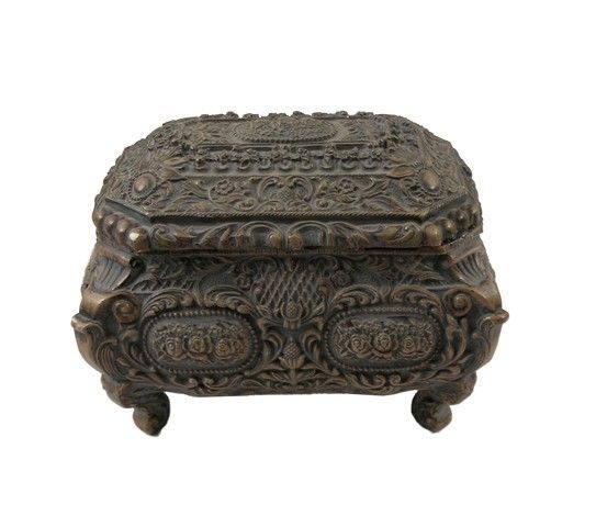 Pirates Of The Caribbean Black Pearl Engraved Metal Box Prop - An ornately engraved and carved metal octagon box used as a background set prop for "Pirates of the Caribbean: The Curse of the Black Pearl". (Approx. 9 1/2" x 6 1/2").