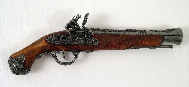 A beautifully detailed background wood and metal prop flintlock non-working gun from "Pirates of the Caribbean Dead Man's Chest" (2006). (Approx. 15" long).