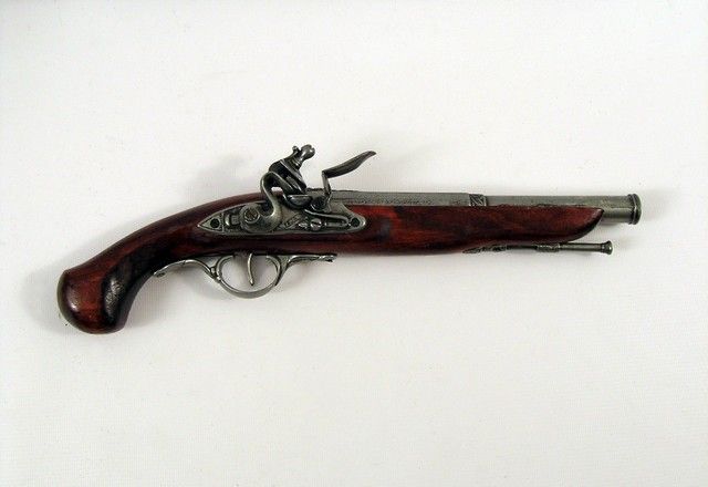 Pirates Of The Caribbean Dead Man's Chest Flintlock Pistol Prop - The "Pirates" franchise is known for almost hyper-scrupulous detail to the look of each motion picture in both photography, costumes, sets, make-up, props and costumes. This is an intricately wood and metal faux-flintlock pistol used in "Pirates of the Caribbean: Dead Man's Chest (2006). (Approx. 15" long).
