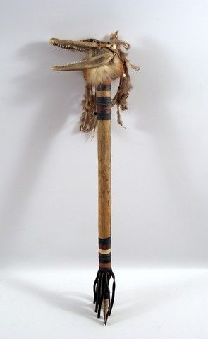 Pirates Of The Caribbean Dead Man's Chest Headhunter's Alligator Weapon Prop - Things go for bad to worse, in "Pirates of the Caribbean: Dead Man's Chest" (2006), when Capt. Jack Sparrow (Johnny Depp) and his crew run aground on an island of headhunters! This is a beautifully crafted headhunters spiritual weapon affixed with a "mummified" alligator head used in the production. (Approx. 28" long).