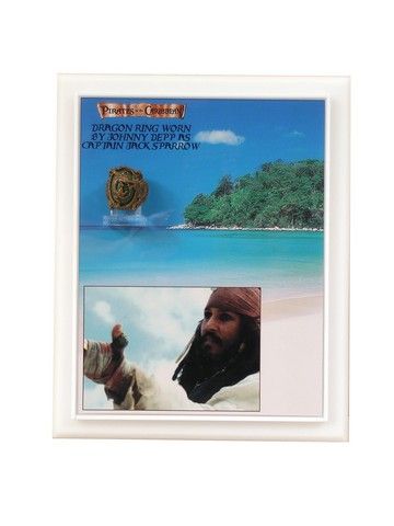 A great iconic piece for fans of Johnny Depp and collectors of "Pirates" memorabilia! From the second installment in the massively successful 'Pirates of the Caribbean", series of films, "Dead Man's Chest", this is Jack Sparrow's (Johnny Depp) hero screen worn "Dragon" Thumb ring. It is made of high-intensity rubber, and is carefully painted in gold to highlight the carvings including the flying dragon on the front. The ring is displayed in a custom made Plexiglas holder (it can be removed easily), attached to a beautiful production shot from the movie, including a screen capture of Depp wearing the ring which is personally autographed by Depp. This is also framed and encased in a custom Plexiglas frame. (Ring is approx. 1.5"x2"x2", full display frame is approx. 11"x9"). Comes with a COA of the ring and a second COA for Depp's autograph.
