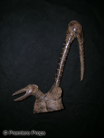 From the 2006 Gore Verbinski feature 'Pirates of the Caribbean: Dead Man's Chest,' this is a background prop statue from the hut of Tia Dalma (Naomie Harris). Tia Dalma lives alone on an island inhabited by cannibals, and trades charms and magical objects with those who visit her. The statue is carved from a piece of wood and features a long-necked pelican head attached to a serpent head. (measures approx. 10 1/2" long)