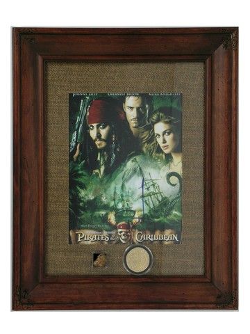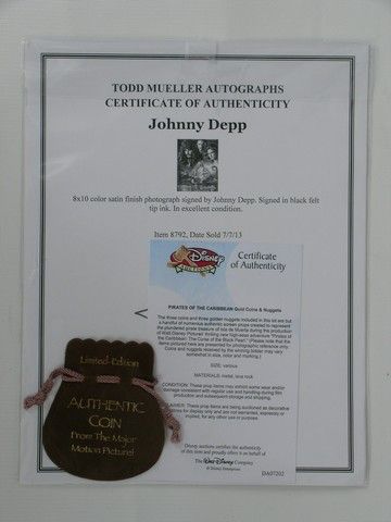 Framed "Pirates of the Caribbean" artwork autographed by Johnny Depp, with framed gold nugget and gold coin screen used in the film "Pirates of the Caribbean - Curse of the Black Pearl" (2003). COA included from Todd Mueller Autographs for the signature, plus COA from Disney Auctions for the gold nugget and gold coin, as well as felt bag from Disney that reads "Limited Edition Authentic Coin from the major motion picture" Beau fully framed and matted. Approx 18" x 15".