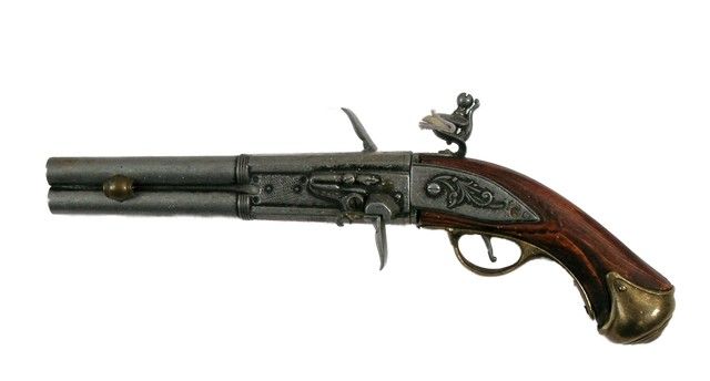 Pirates Of The Caribbean Stranger Tides Flintlock Pistol Prop - In the fourth installment, "Pirates of the Caribbean: On Stranger Tides" (2011), Sparrow and Barbossa are on a quest to find the legendary fountain of youth,. This is a over-under metal and wood flintlock pistol used in the production. (Approx. 14" long).
