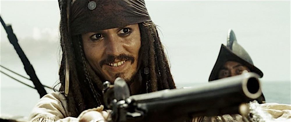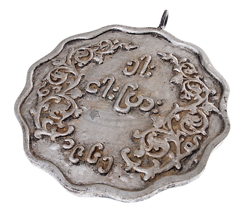 (Disney, 2007) This prop oversized charm was custom-made by the production for use by Johnny Depp as "Captain Jack Sparrow". The charm is made of resin and detailed to look like Jack Sparrow's normal sized charm worn in his hair. The oversize charm was created for use by the "miniature" Jack Sparrows as they stand on Jack Sparrow's shoulders to talk with him. The charm measures 14" in diameter and has minor wear from use.