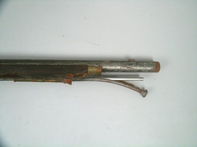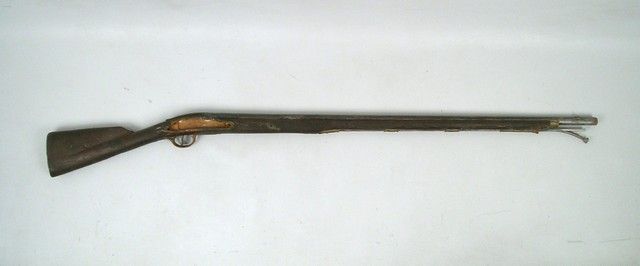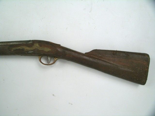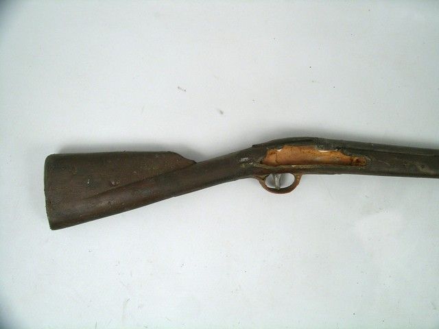 An action stunt prop from "Pirates of the Caribbean: At World's End" (2007). It is a heavily distressed foam rifle prop with rigid core. Approx. 58" long, and 5" tall at base. Foam detached from rigid core at ball blunder. Empty trigger assembly area. Oversized item. Additional postage required.