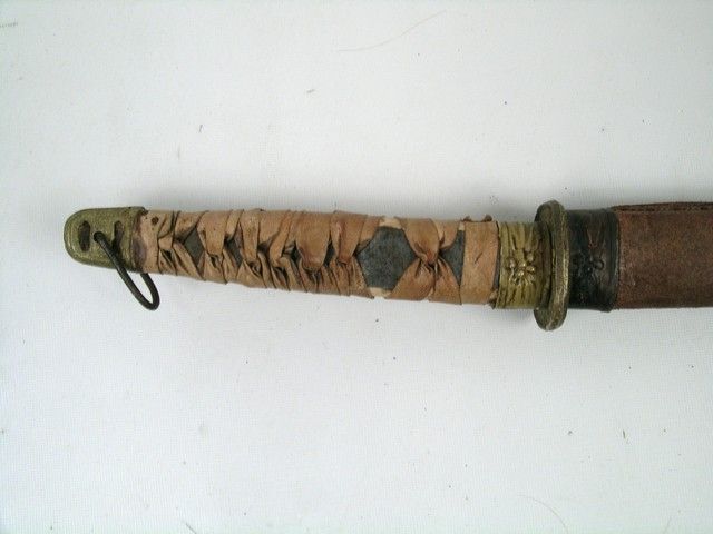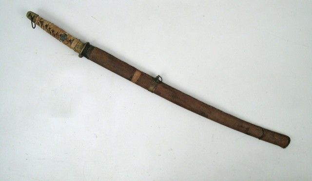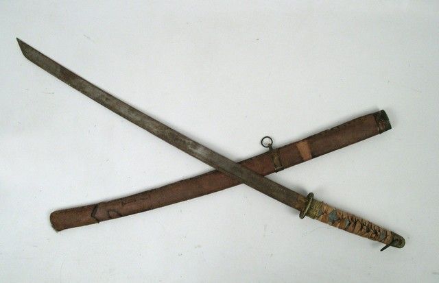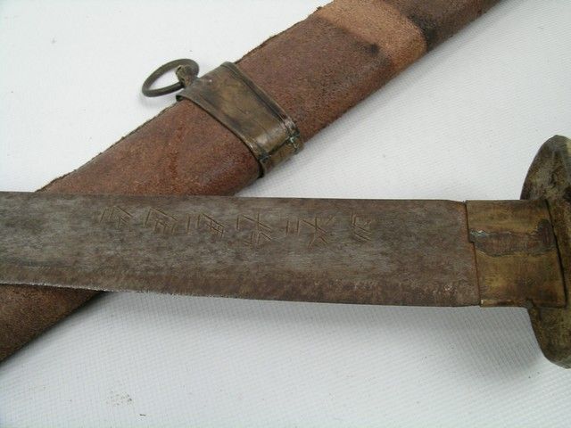 "Pirates of the Caribbean: At Worlds End" prop sword from Pirate Lord Sao Feng's lair. Heavily distressed. Metal blade with Asian characters etched into blade, leather wrapped handle. Distressed sheath. Approx. 37" long. Oversized item. Additional postage required.