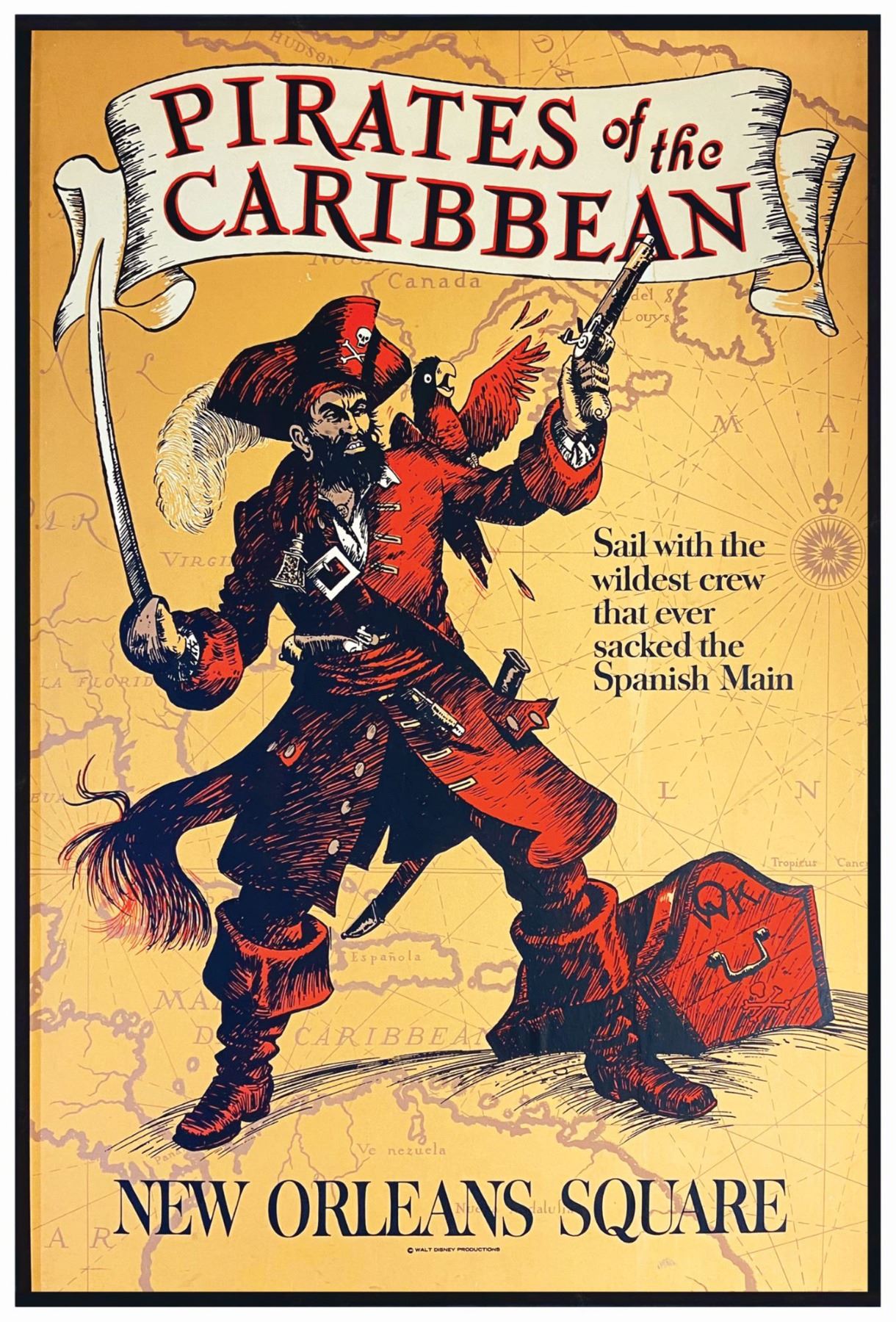 (Disneyland, 1967) An extremely rare, original hand-silkscreened attraction poster for the Pirates of the Caribbean. Designed by Collin Campbell, this poster is one of the more difficult to find, and is always in demand among collectors. The poster has been vintage mounted to board within a wooden frame without glass. The poster measure 54"x36" and the frame measures 54.5"x36.5". The poster is in fair condition with several scratches, nicks, and general wear from use and display. There is some moisture discoloration to some areas of the poster. Special shipping arrangements may apply. Please inquire for details and estimates.