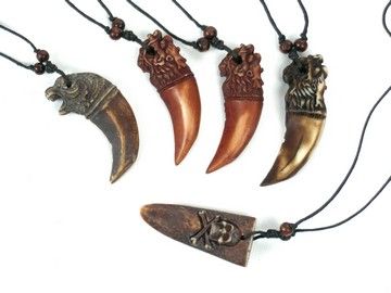 From the granddaddy: "Pirates of the Caribbean: Curse of the Black Pearl" (2003), this is an exquisite set of screen used pirate necklaces (5 pieces) worn by background actors with faux-shark's teeth, and carved animals, fish and skull and cross-bones. (each necklace piece approx. 3" x 1" x .5")