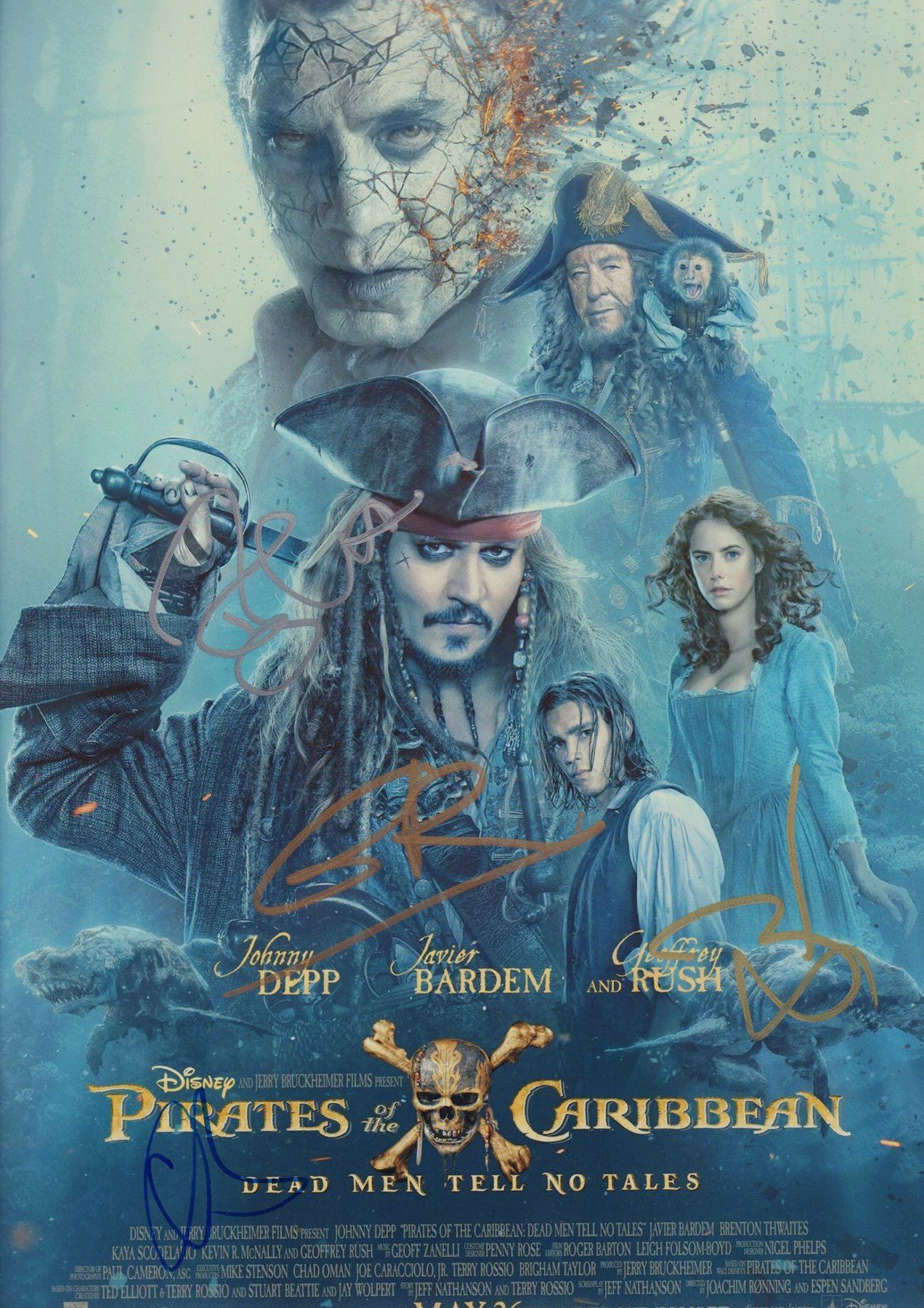 Color 11x17 mini poster for the film Pirates of the Caribbean: Dead Men Tell No Tales signed by Johnny Depp, Orlando Bloom, Geoffrey Rush and Brenton Thwaites. The signatures have been certified by Global Authentics and issued number GV866890. All items come with a certificate of authenticity good for the life of the piece.