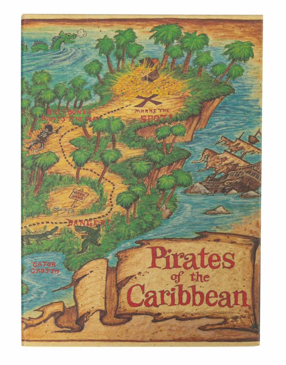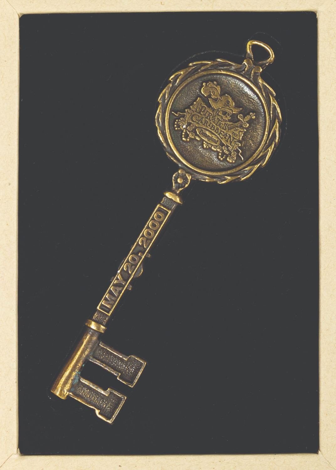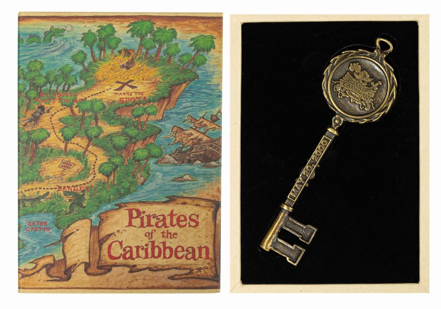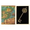 (Disneyland, 2000) A Pirates of the Caribbean commemorative treasure chest key created for the attraction's 33rd anniversary. The key is presented in a cardboard clamshell box with printed treasure map graphics on the exterior. Measuring 5.5"x1.75", the key is in very fine, as-new condition. The box measures 5.25"x7.25" and 1" deep and exhibits only minimal wear.