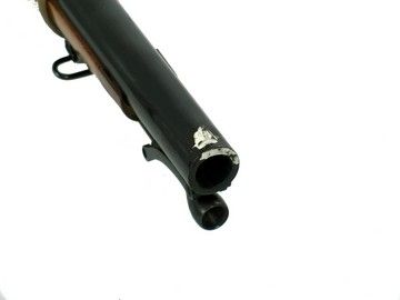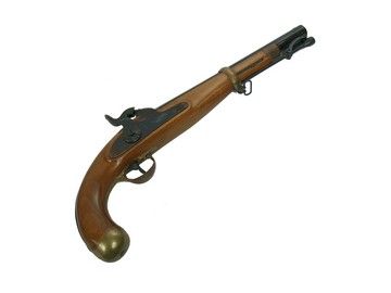"Pirates of the Caribbean: Curse of the Black Pearl" pirate pistol used by one of the background pirate actors. This is a custom made Cap and Ball Pistol, not a reproduction. With an Oak Stock, Brass, and Metal Accents. Weights around 3 pounds with working mechanics. Made in Italy. Has some white paint on the tip of the barrel and front gun sight. (approx. 18.5" x 7" x 2")