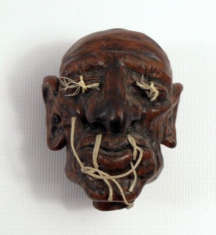 Pirates of the Caribbean Dead Man's Chest Cannibal Island Shrunken Head Prop - Pirates of the Caribbean Dead Man's Chest Wood Shrunken Head Prop - A wonderfully macabre wood-carved 'shrunken head" with rope tied eyes, nose and mouth from "Pirates of the Caribbean: Dead Man's Chest (2006) from the Isla de Pelegostos (Cannibal Island) sequences. (Approx. 3" long).