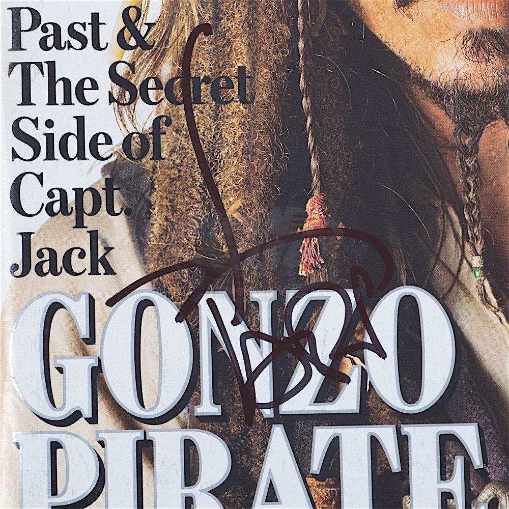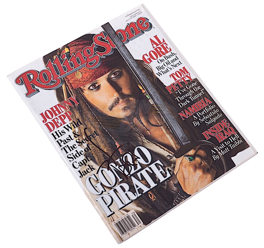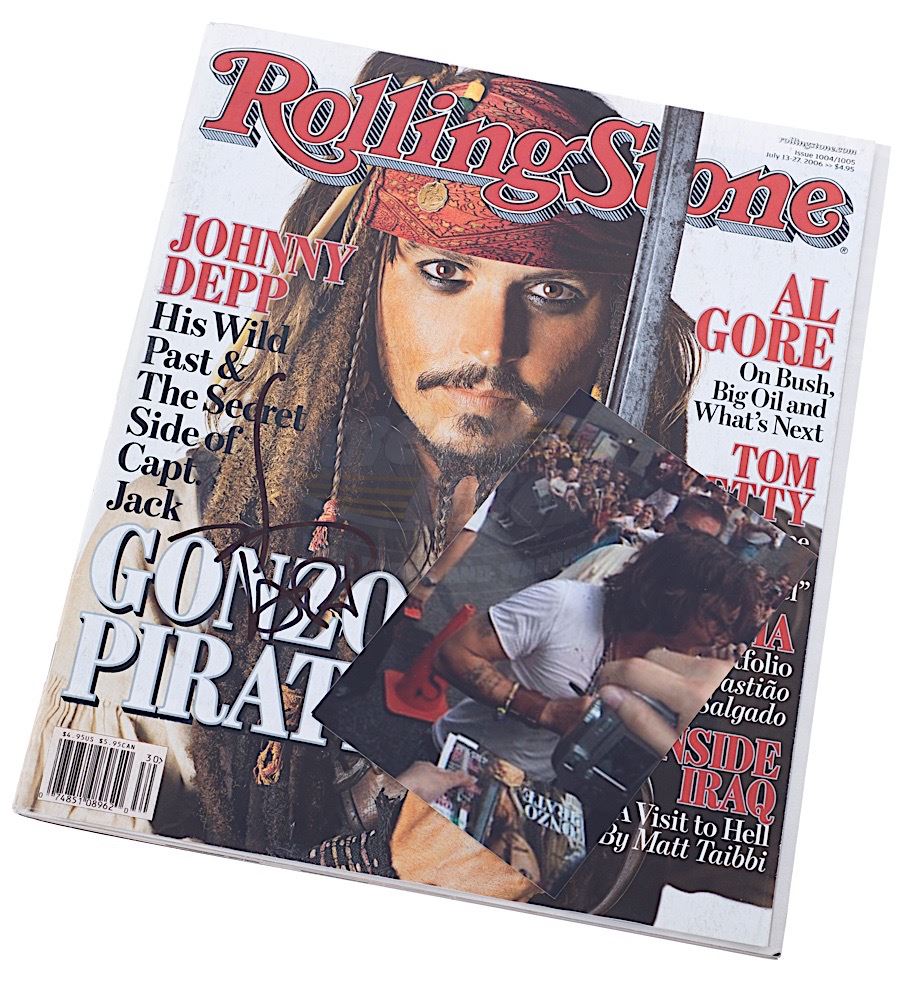 (Walt Disney, 2006) This vintage "Rolling Stone" is dated July 2006 and features Johnny Depp on the cover as Capt. Jack Sparrow. The cover has been autographed by Johnny Depp in black marker at the L.A. premiere of "Dark Shadows". The magazine measures 12" x 10" and remains in fine condition. A 4" x 6" photograph of Johnny Depp from the event is included with the magazine.
