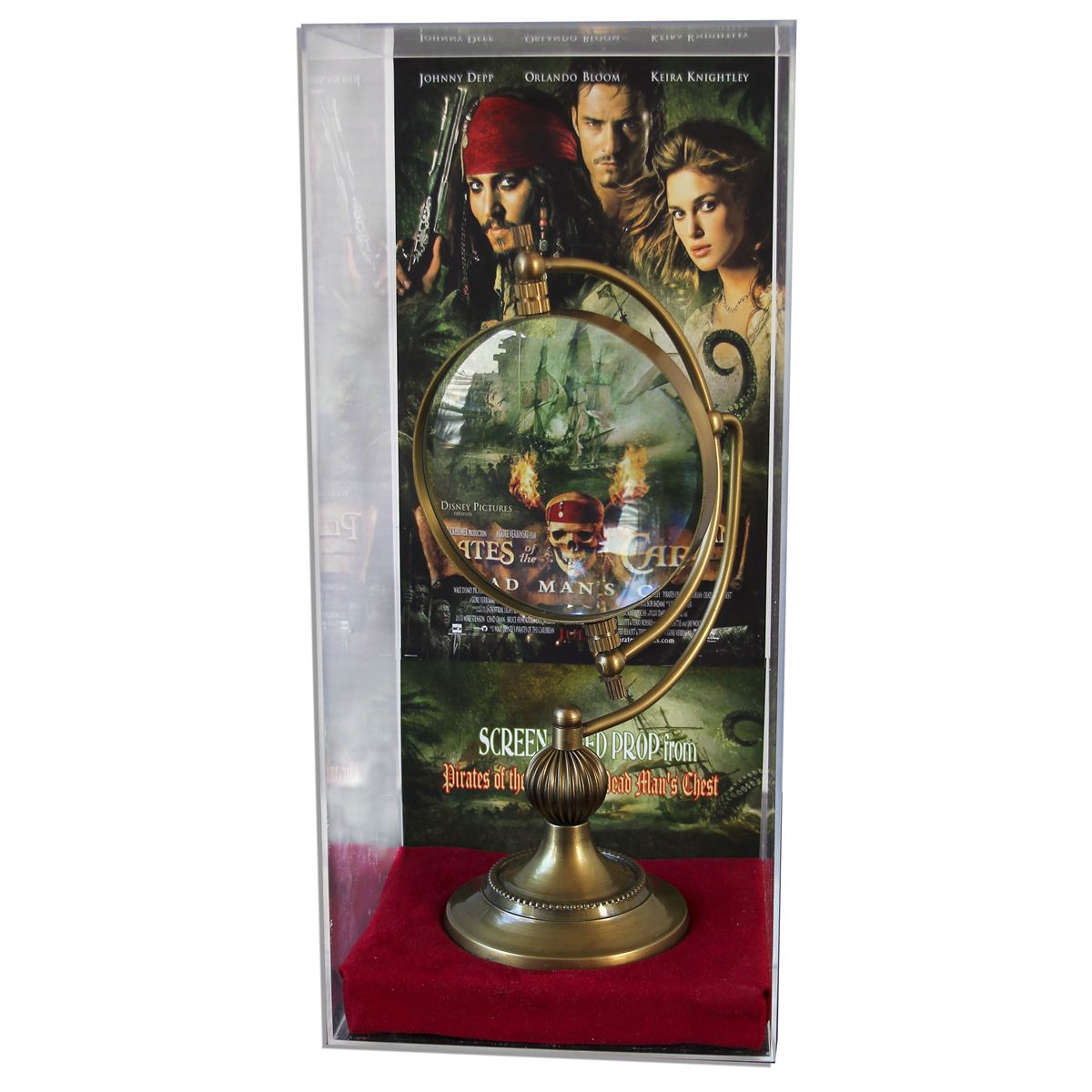 Magnifying glass prop used onscreen in ''Pirates of the Caribbean: Dead Man's Chest'' magnifying glass. Desktop magnifier used in conjunction with the treasure map features a swiveling axis made of brass. Measures 11.75'' in overall height. Lens measures 5'' in diameter. Fine. Beautifully displayed in a case on a red cloth bed with Pirates movie poster background. Provenance from the Estate of Gerry Moss; Heritage Music & Entertainment Auction, July 2011, lot 46111.