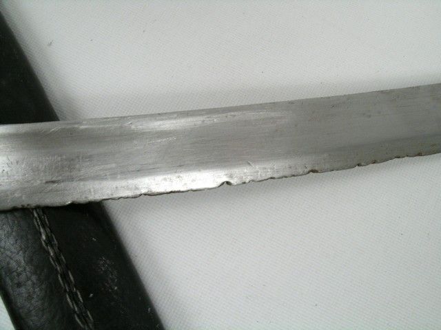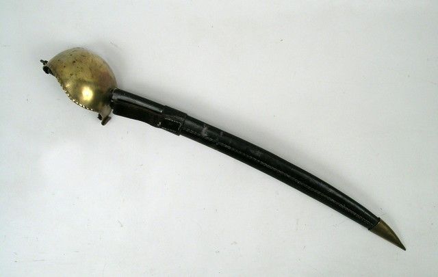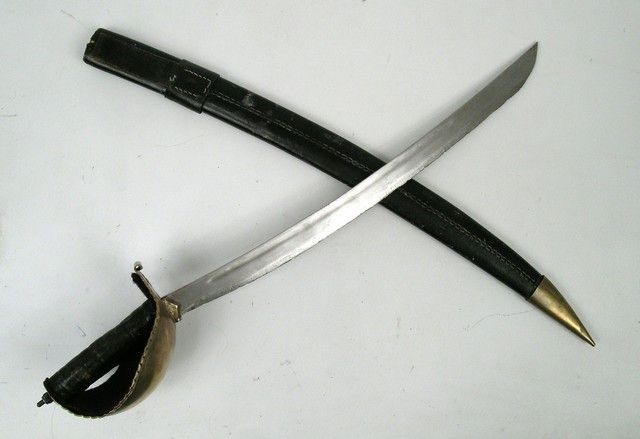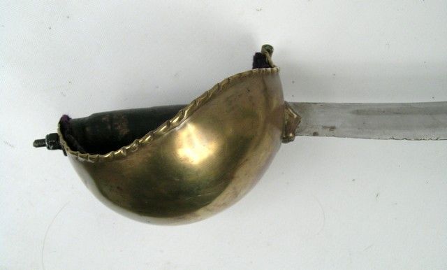 "Pirates of the Caribbean: Dead Man's Chest" sword prop, Brass hand guard, metal blade with heavy distressing, leather sheath with brass tip. Approx. 34" long. Oversized item. Additional postage required.
