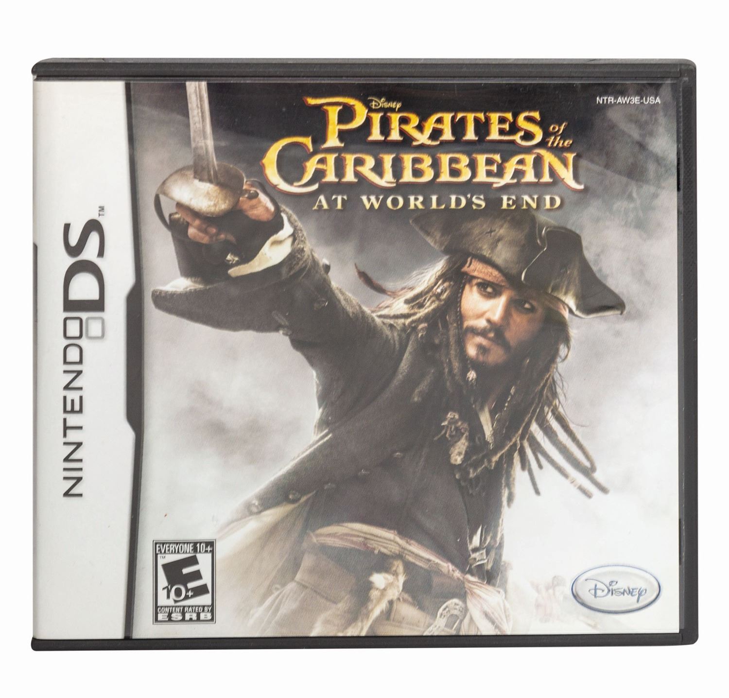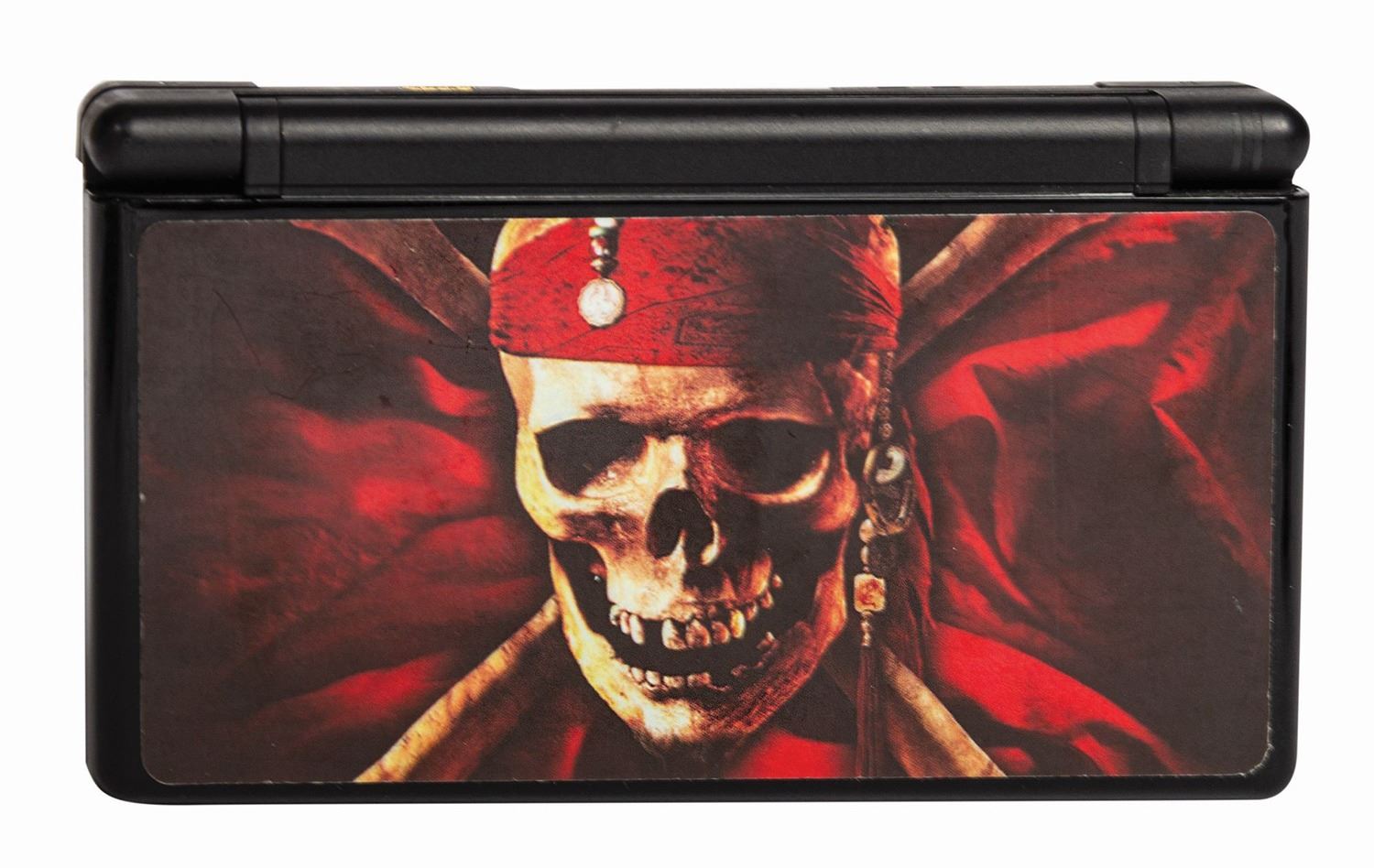 (Disney, 2007) An incredibly rare limited edition Nintendo DS Lite console with a Pirates of the Caribbean skin and the Pirates of the Caribbean: At World's End video game. This extremely rare console was given to lucky guests during the premiere for Pirates of the Caribbean: At World's End on May 19, 2007. While 1500 tickets were sold, it is estimated that approximately only 150 of these consoles were handed out. The front features a custom skin of the classic skull and crossbones logo of the films, while the back shows Jack Sparrow and Sleeping Beauty Castle. This version of the DS Lite is one of the rarest versions of the console ever offered, as it was never sold to the general public. The console measures 3"x5.25", and the game box measures approximately 5"x5.25". Both are in good condition, with some scratching and scuffing to the surface of the console, as well as some edge-wear on the decal.