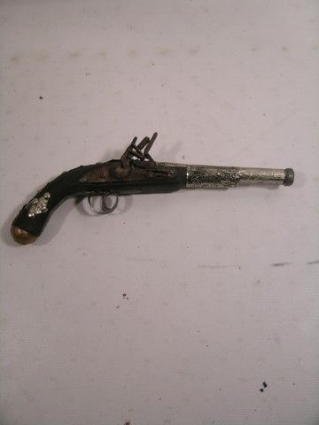 A flintlock pistol background prop used in the 2003 summer hit, 'Pirates of the Caribbean: The Curse of the Black Pearl', starring Johnny Depp and Keira Knightley. Made with strong attention to detail, including engraved designs along the body and barrel, and an elaborate firing mechanism. The word, "Universal" is engraved on the stock. (Measures approx. 14" x 2" x 6.25")