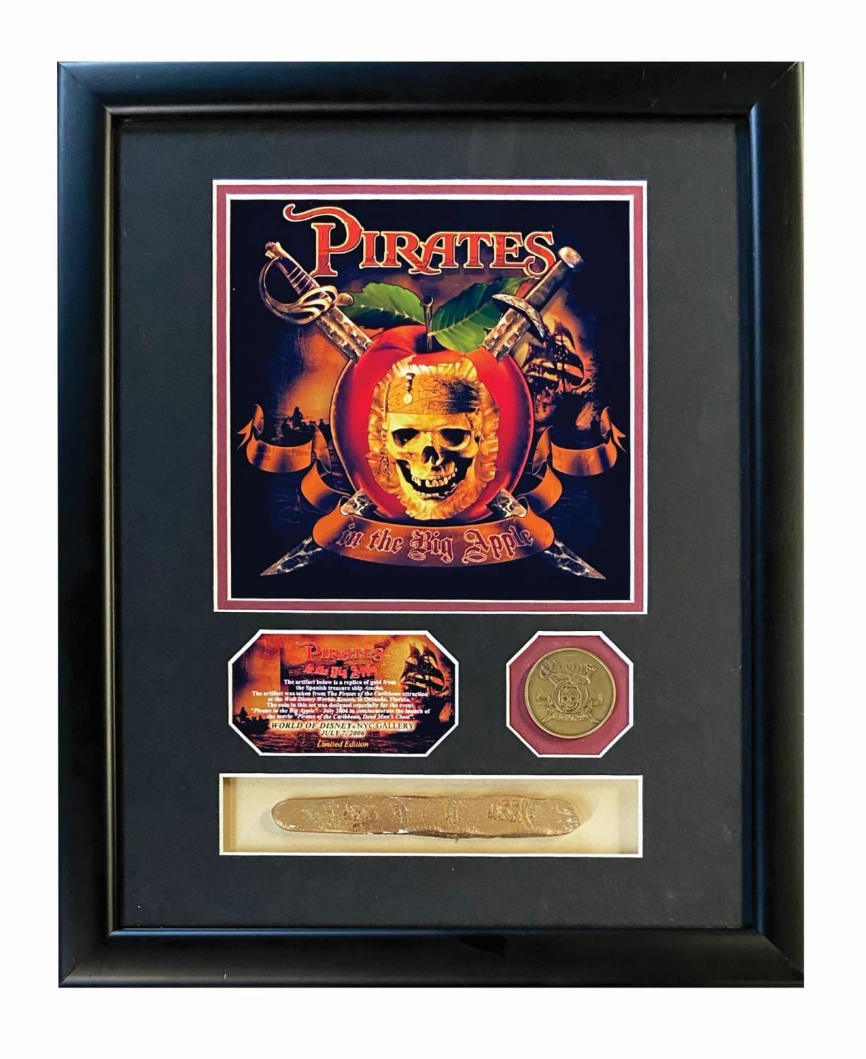 (Disney, 2006) A limited edition Pirates of the Caribbean framed display set from the Pirates in the Big Apple event on July 7, 2006. Held at the New York City World of Disney store, the event celebrated the premiere of Pirates of the Caribbean: Dead Man's Chest and included a reception and a screening of the film. The display is custom-matted and includes a pirate gold prop taken from Walt Disney World's Pirates of the Caribbean attraction, a print of the event's logo, and a coin created specifically for the event. Measuring 15.75"x12.75" overall, the set is in very good condition with minor wear to the frame.